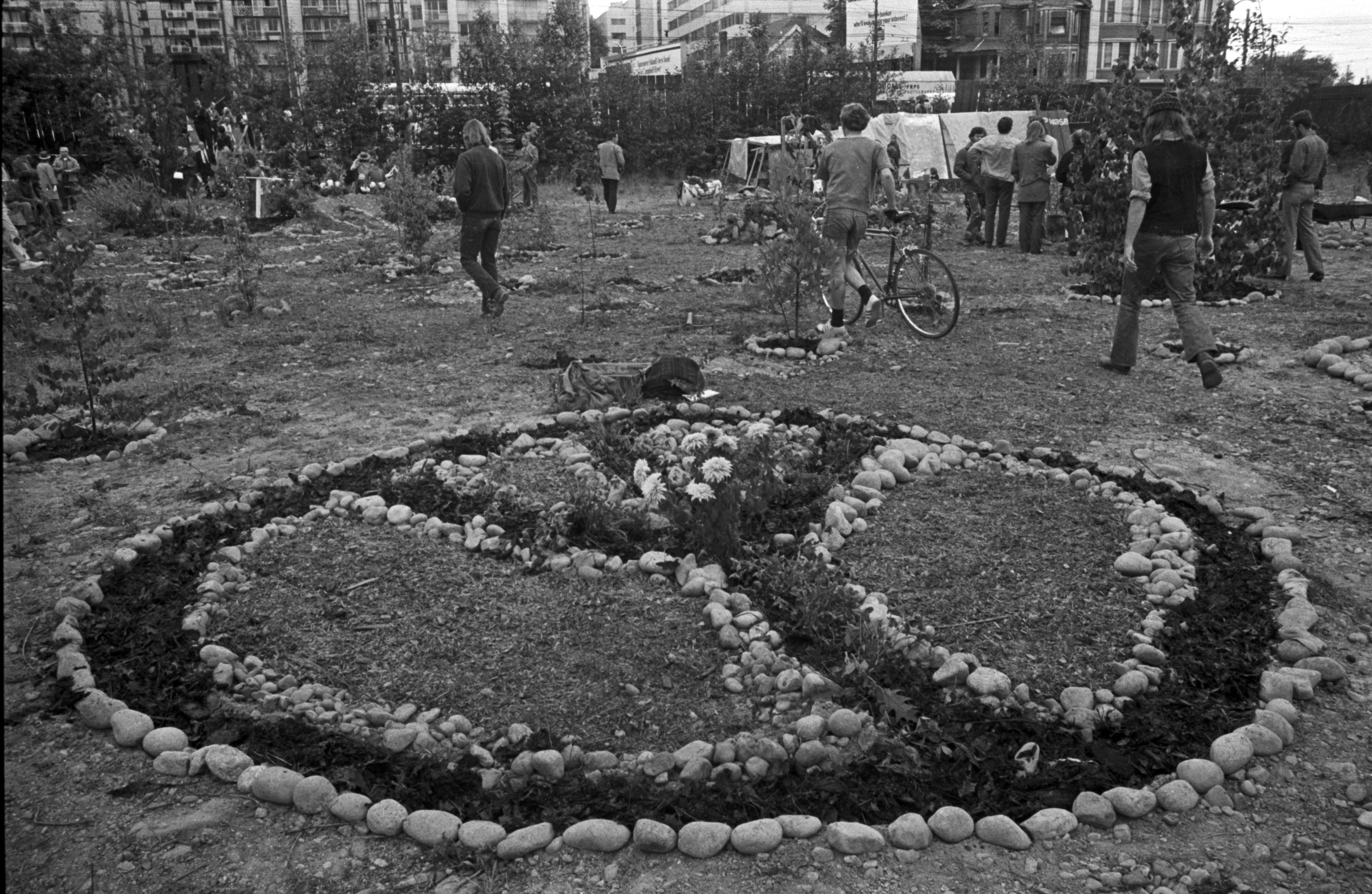 I first heard of the All Seasons Park when I was flipping through Kate Bird’s new release: City on Edge. The photo, taken by Province photographer Gordon Sedawie over 46 years ago, shows a peace sign garden. As the caption explains, the site was occupied by people opposed to the development of a Four Seasons hotel and condo complex at the Coal Harbour entrance to Stanley Park.