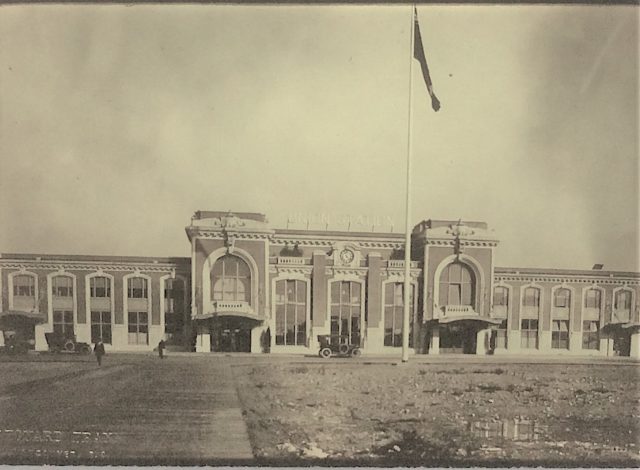 Union Station was designed by Fred Townley for the Great Northern Railway. It sat next door to our current Pacific Central Station. By the end of the Second World War rail travel was on the decline and the GNR offered the station to the City of Vancouver for use as a museum and library. The city declined and the station was demolished in 1965. It’s been a parking lot ever since.