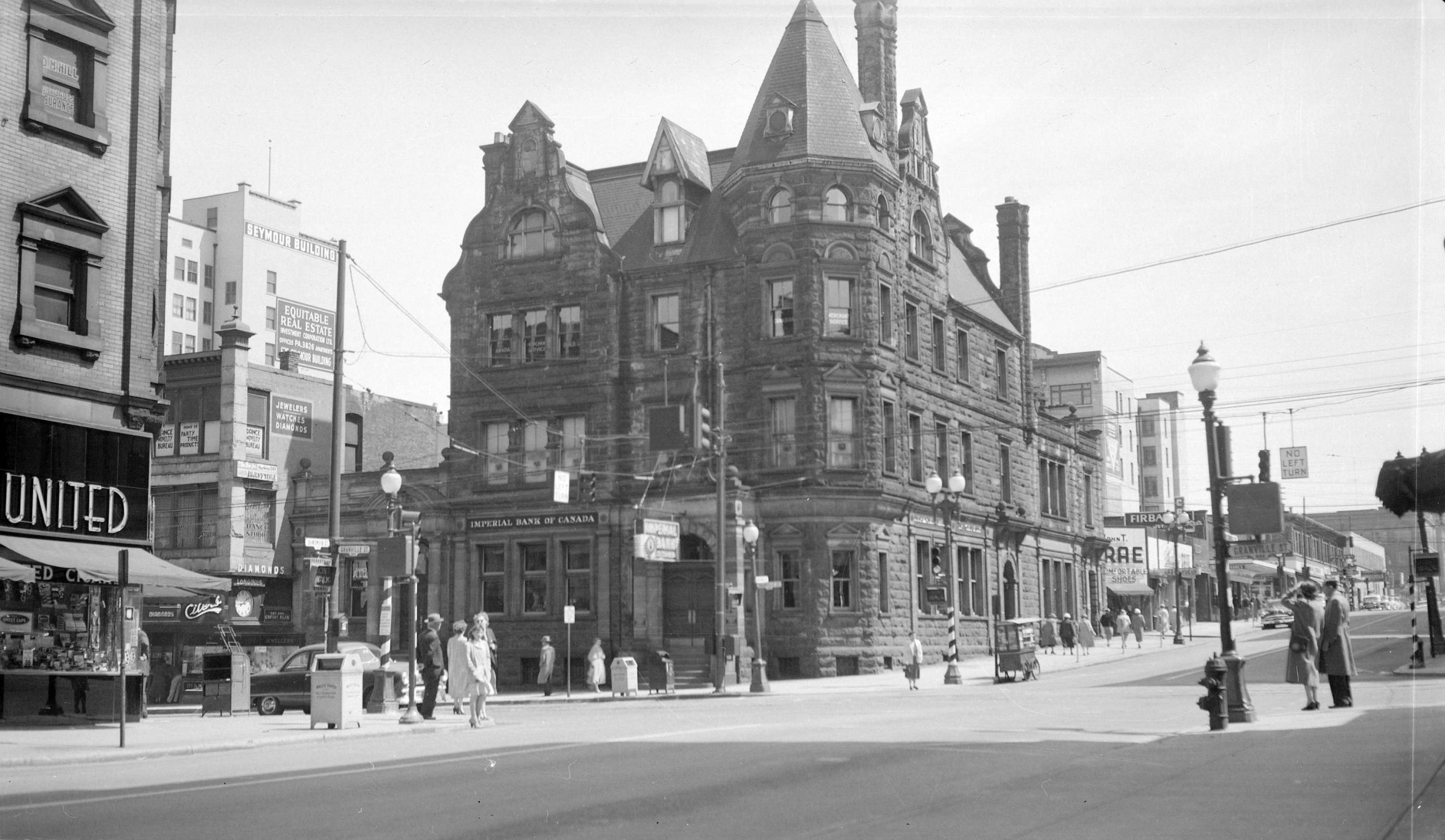 The Imperial Bank of Canada opened its new building on April 21, 1958 at Granville and Dunsmuir Streets. It featured this stunning mural by BC Binning. The building is now occupied by a Shoppers Drug Mart, but the mural is still there.