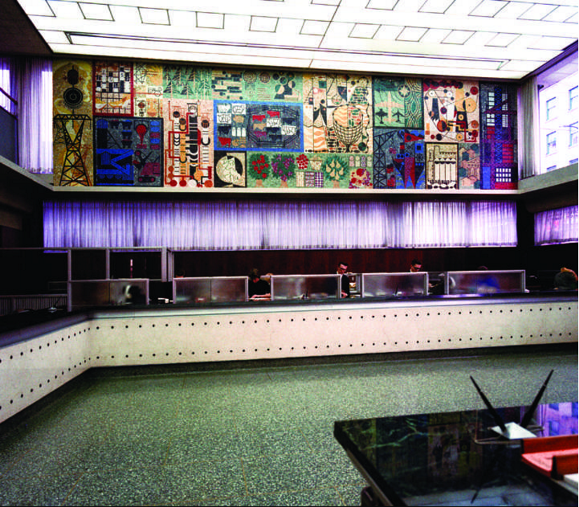 Although it’s probably best not to, if you go up to the second floor, you can actually touch one of the 200,000 pieces of Venetian glass that make up this massive mural that dominates the entire length of the wall. Binning, an artist who taught architecture, was commissioned by the Imperial Bank of Canada to celebrate the province’s booming resource-based economy, from hydroelectricity and forestry to shipping and agriculture, with a “key” to help interpret it.