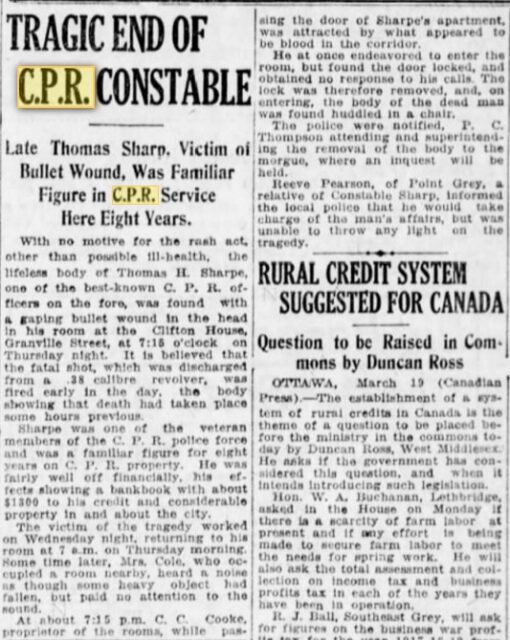 A couple of months ago Murray Maisey sent me a clipping from the World regarding the death of Thomas Sharpe. Because Constable Sharpe worked for the CPR, I forwarded the clipping to Graham Walker, who did such an amazing job uncovering the murder of Special Constable Charles Painter last year. Graham, now a constable with the Saanich Police… Continue reading The Tragic Death of CPR Constable Thomas Sharpe