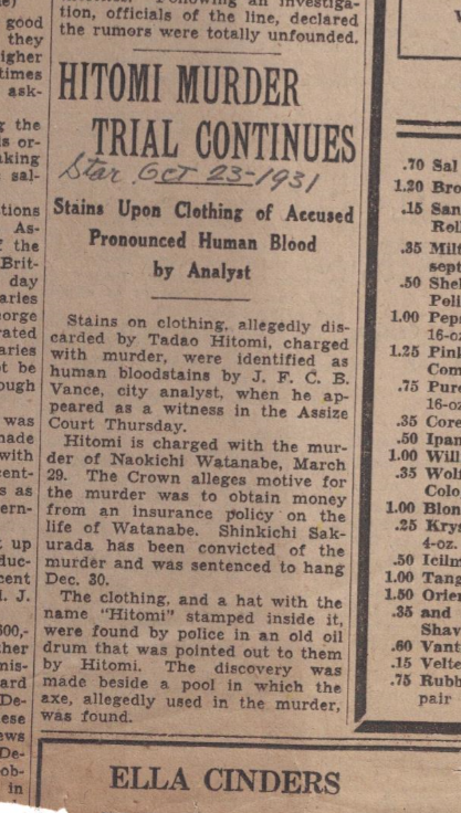 When I was going through John Vance’s personal files for Blood, Sweat, and Fear, a small article torn from the pages of the long defunct Vancouver Star caught my eye. Vance’s handwriting dated it October 23, 1931 and it mentioned the murder of Naokichi Watanabe. Vance had clearly kept the clipping because he had testified… Continue reading The East Cordova Street Murder Factory