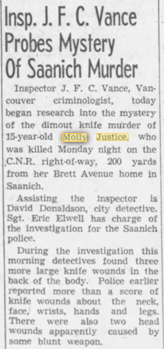 In January 1943, fifteen-year-old Molly Justice, took the 5:50 pm bus from her job in Victoria, BC to her home near Swan Lake. Because war-time dim-out regulations were in force, there was no lighting along the streets, and that may be why Molly decided to take the short cut home along the unlit tracks by Swan Lake, shaving off almost half-a-kilometre from her walk.