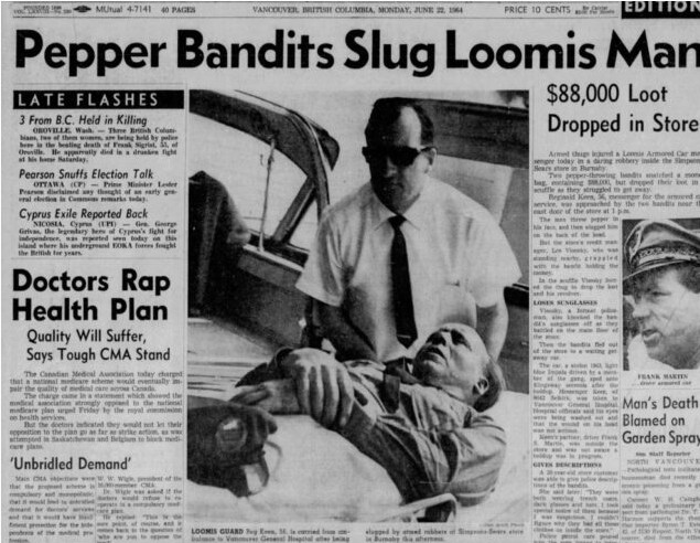 The first job at the CIBC on Kingsway in Burnaby went off without a hitch, and they escaped with $106,000. In 1964 they knocked over the Simpson Sears on Kingsway. The following January they robbed the Bank of Nova Scotia at Dunbar and West 41st Avenue.