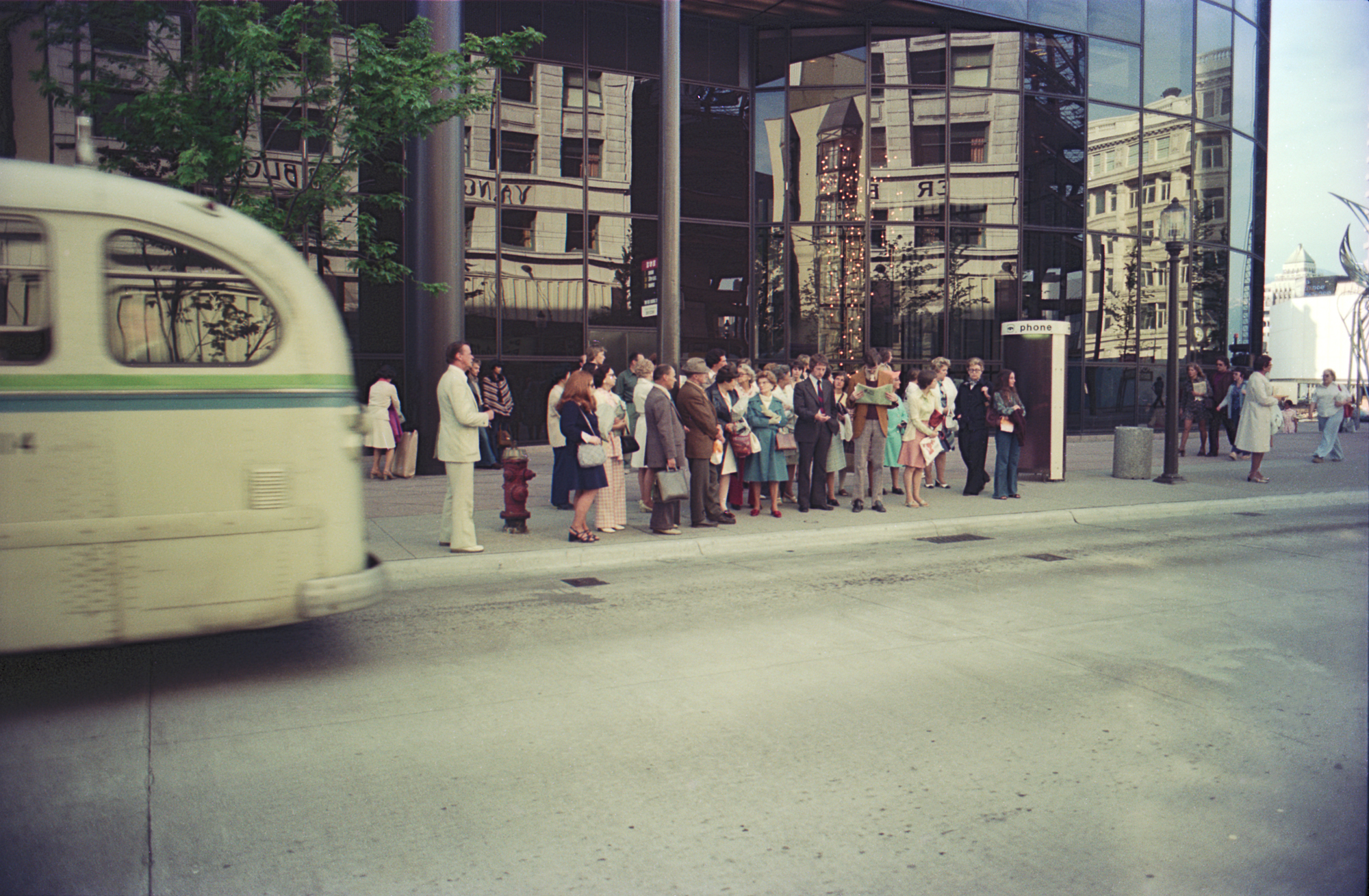 The Svend-Erik photo shows a 1949 Brill T-48 model in B.C. Hydro colours. Those phone booths were futuristic, but the pay phones inside were still vintage “drop coin” versions. The Granville Mall original post-top street lights were closely spaced and incandescent. They had a cluster of small tube type bulbs as used in display cases. The light output was low level and free from glare, and complemented the street at night. Later they were replaced with intense high-pressure orange sodium vapour bulbs in the same fixture. The night time ambience was never the same again. You can see the top of the Marine Building from this vantage point.