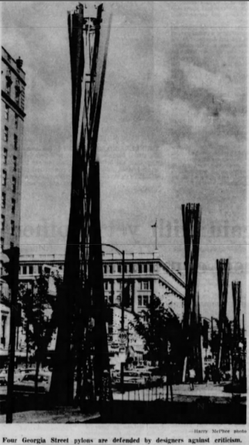 Not surprisingly, the pylons which ran between Granville and Howe Streets, brought out intense emotions. Mayor Tom Campbell thought they looked like “crashed airliners.” He took a bunch of reporters to look at them in the Cambie Street city works in his city-paid limousine and told them: “This is a scrap dealer’s field day, we bought $32,000 worth of junk.” “Tom Terrific,” as the mayor was not affectionally known as, added that it cost taxpayers “$100 a foot.”