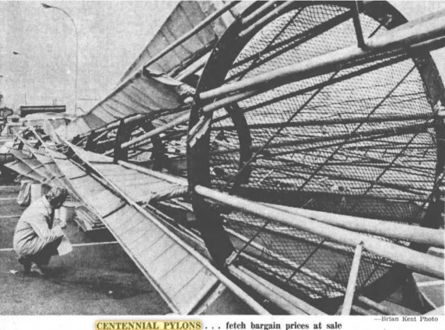 Ben Wosk picked up all four pylons for under $3,000. He bought them for a $10 million development at Whistler (which never eventuated). Wosk outbid five others including Arnold Schuck, who wanted to turn the pylons into giant scissors to advertise his furniture business.