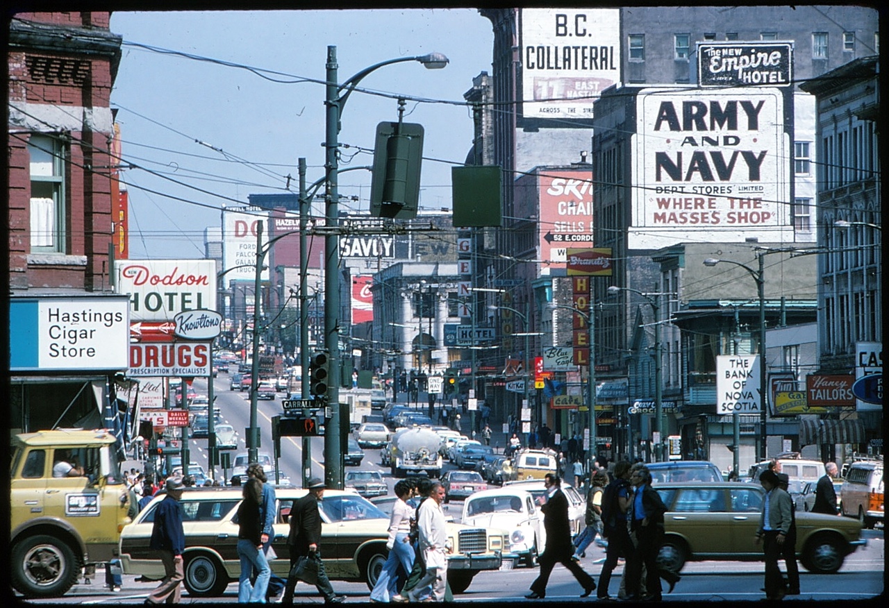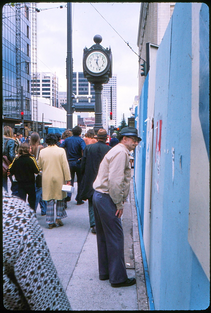 The gentleman peeking through the fence at Georgia and Granville is likely looking at the crater left from the demolition of the Birk’s Building. Birks had other locations in 1977: Harbour Centre, Oakridge, Park Royal, Surrey Place, Guildford and Richmond Centre. They are presently at the former Bank of Commerce Building at Hastings and Granville, Oakridge and Park Royal.