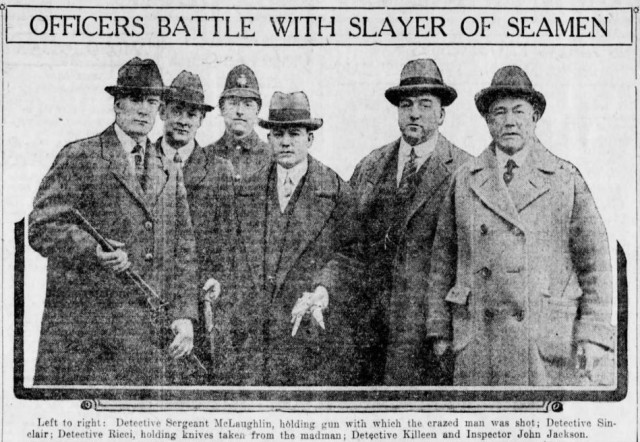 The clipping has the same photo taken from a different angle, but it’s clearly the same event and it ran with the quite wonderful caption: Officers Battle with Slayer of Seamen.