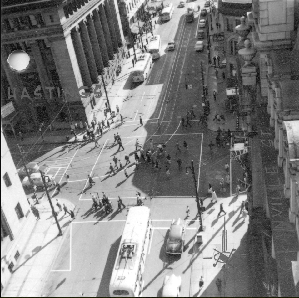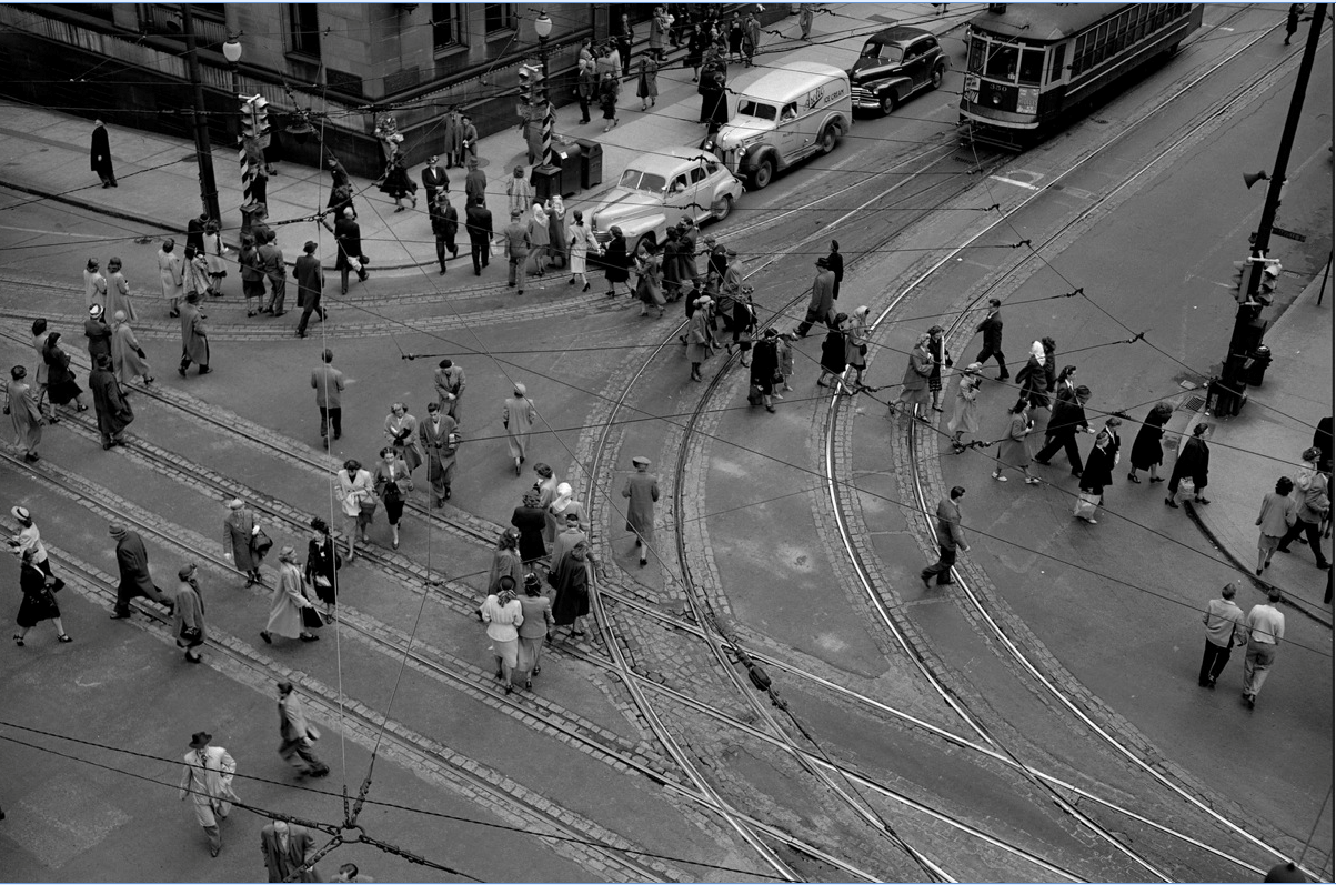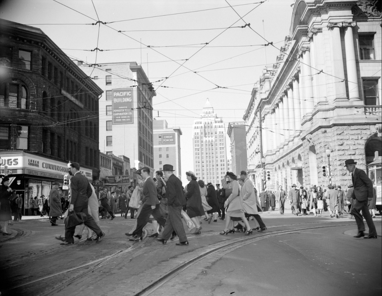 According to Wikipedia, Vancouver was one of the first cities in the world to use them at Granville and Georgia and Granville and Hastings Streets way back in the 1940s. After that it caught on with a traffic engineer from Denver, Colorado who introduced the scramble to his city in the late 1940s and it became known as the Barnes’ Dance, because “Barnes had made people so happy they’re dancing in the streets.”