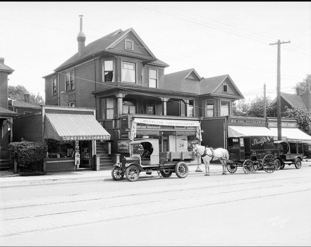 Murray Maisey tells me that the house at Granville (near 12th) was originally owned by Maud Leslie. Maud and her daughter June added a book store called The Library in 1928 at #2820. City directories for that year show Beattie Realty at 2818, which later became the Antiseptic Barber Shop in 1935 (today it is the Black Goat cashmere shop). Daniel le Chocolat is the current tenant at 2820. Check out Murray’s story on his awesome blog Vancouver As it Was.