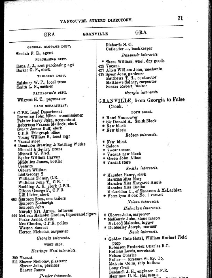 The granite-faced New York block (658 Granville) which Price designed in 1888, and the Daily World described as “the grandest building of its kind yet erected here, or for that matter in the Dominion,” would be replaced by the existing Hudson’s Bay store in the 1920s. According to the 1890 city directory, the building had a mixture of residents and businesses including the Dominion Brewing and Bottling Works, the CPR telegraph office, and John Milne Browning, the commissioner for the CPR Land Department.