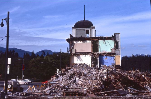 Barb Wood painted the Stuart Building on the cover of a Vancouver centennial engagement calendar in 1986. After witnessing the demolition, she told Jason Vanderhill: “We were told it was too frail to stand, so it should come down. When they drove the first bulldozer through it, the results were like a Bugs Bunny cartoon—the structure was so sound, that the machine left a bulldozer shaped hole, side to side.”