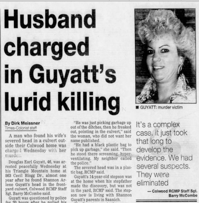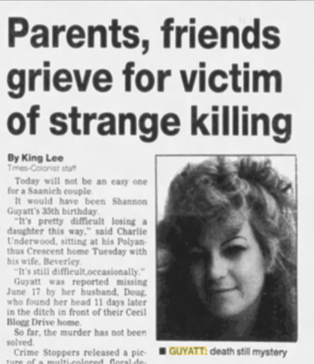 Doug Guyatt was cleaning up the front yard of his Colwood home one afternoon in June 1992 when he found his wife’s severed head in a bag in the ditch. A neighbor watched from her window as the firefighter stood there screaming and hyperventilating, the Glad Kitchen Catcher garbage bag at his feet. The head of his 34-year-old wife was crudely hacked off at the jawline, her long, silver-grey hair shorn from her head. She’d been missing for 11 days.