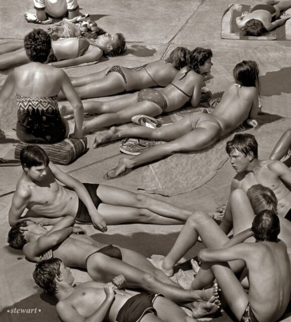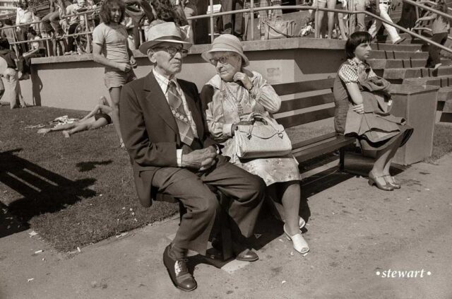I remember the fog horn. It had a defect and it sort of shuddered at the end of the blast. I see a phone booth at the Lifestream Natural Foods. For many years there was a large orange carrot sidewalk sign in front of the store. I think the Dickie Dee ice cream bicycle had bells that jingled as it came down the street. Stewart’s photos really capture a time before sun block lotions.