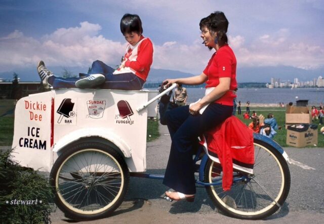 The Dickie Dee Ice Cream bike was a familiar sight all over Vancouver in the ’70s. “Bar, Sundae and Fudgsicle all 15 cents each,” notes Bruce. “And, check those prices on produce!”