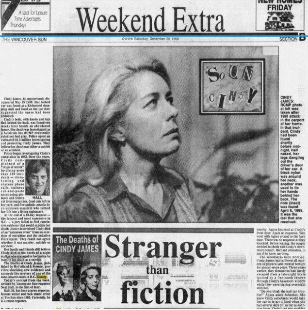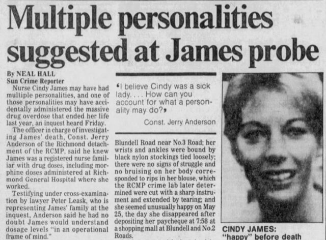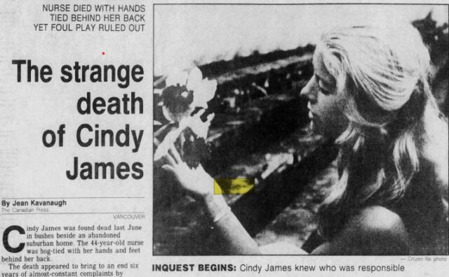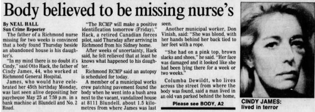The most bizarre case I ever encountered in my 30-plus years as a reporter, was the case of Cindy James. Her body was found June 8, 1989 in some brambles beside an abandoned house in the Vancouver suburb of Richmond, Canada.