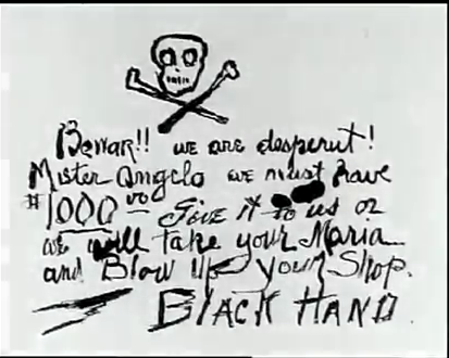 The Black Hand (La Mano Nera) was an extortion racket, a sort of early form of the Mafia, that was well established in major Italian communities in American cities in the early part of last century.
