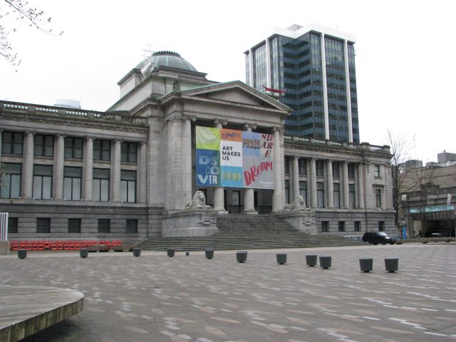 The Centennial Fountain replaced Charles Marega’s from 1912. His fountain languished in storage until 1983 when the VAG moved into the building, and it was installed at the Hornby Street side.