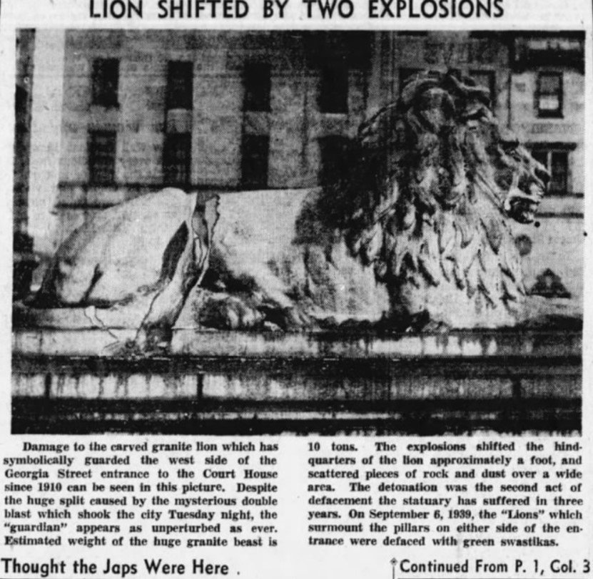 It’s been over seven decades, but I’m confident that the mystery of who blew up one of the courthouse lions in 1942 has now been solved. No one will be charged for this crime, but it’s thanks to a reader—we’ll call him Dave. It was his grandfather who made a bang loud enough that Vancouverites thought the Japanese were invading the city.
