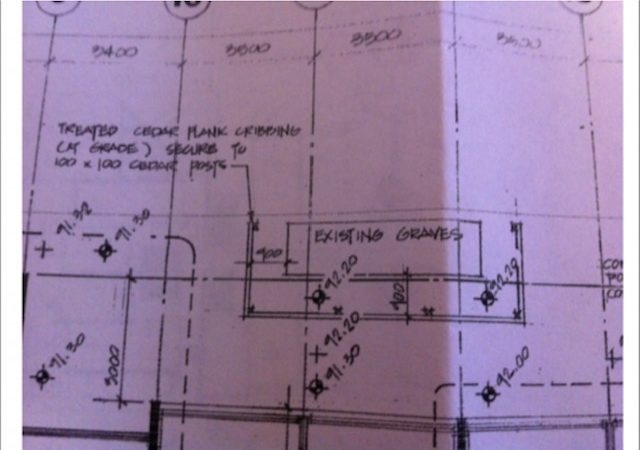 That there are graves, isn’t under dispute, it’s clearly marked on the 1984 plans for development with instructions to place cedar planks around the graves. Doughty has sent me photos that he took this week showing the tiled graves outlined among landscaped beds. It’s possible that the tiles were also added during this period.