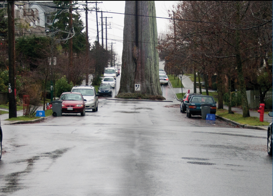 Several years ago, I came across an art project by the Goodweather Collective that re-imagined a Vancouver in which the City had left select old growth trees in those roundabouts that dot the city’s residential neighbourhoods. Their photoshop work was convincing and it was jarring seeing our familiar urban landscape dotted with unfamiliar giant trees. I had been doing my Past Tense Vancouver blog on Tumblr and thought it would be fun to do some photoshopping of my own for April Fools’ Day.