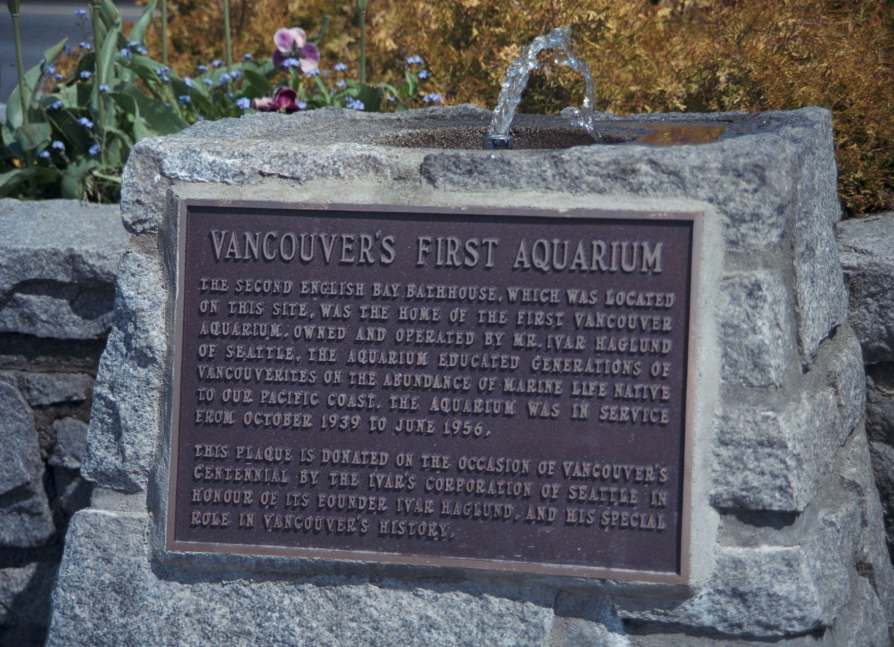 Ivar’s Aquarium closed in 1956, when our current one opened. I found this Vancouver Archives photo of the plaque taken in 1986 and situated just across from Morton Park. Have no idea if it’s still there.