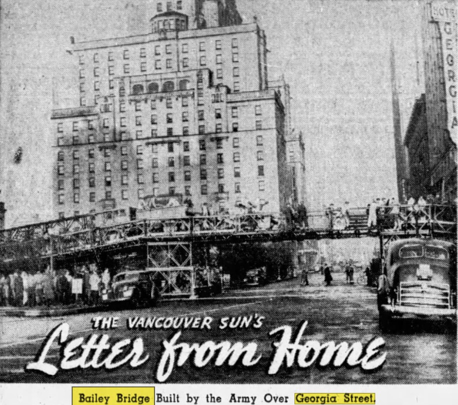 Sorry, I’m known for being pedantic! But the first picture of the Bailey Bridge clearly shows that it was crossing not Howe St but, rather, Georgia St, where Howe crosses Georgia. The final pic, with “Letter from Home” beneath it, shows the highlited caption indicating Georgia St.