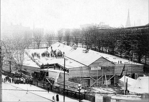 The original courthouse lasted just 20 years. It was demolished when the new law courts opened on West Georgia Street in 1912. The square, which is actually a triangle, is bounded by Hastings, Cambie, Pender and Hamilton Streets. It didn’t remain empty for long. By 1914, it was filled with a military tent, used to recruit soldiers to fight in the First World War. Then, in 1917, up went the Evangelistic Tabernacle.